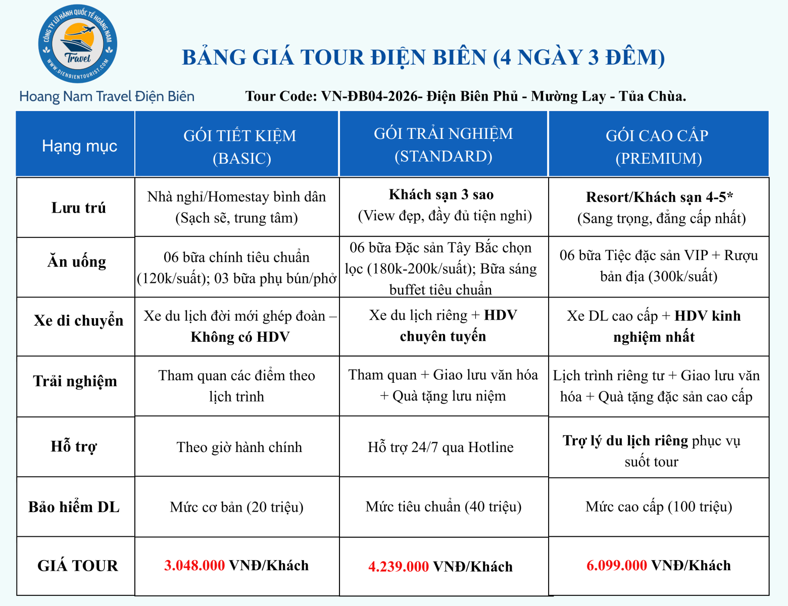 - Trải nghiệm: Vé tham quan, HDV suốt tuyến, bảo hiểm du lịch,