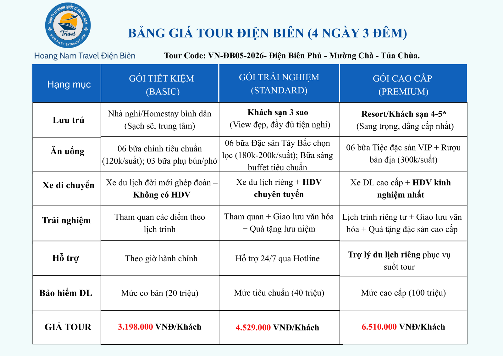 - Trải nghiệm: Vé tham quan, HDV suốt tuyến, bảo hiểm du lịch.
